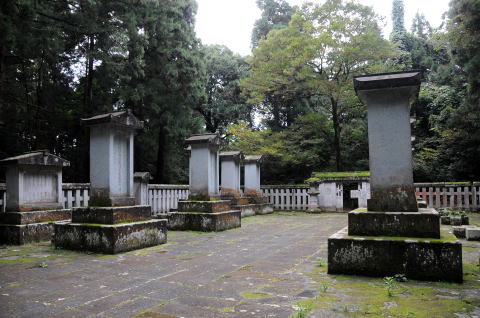 千畳敷:四方は2mの石柱玉垣をめぐらしその中に笏谷石の石板を敷き詰め、高さ3mの墓石が10基相並んで立っている.上野寛永寺の徳川将軍の墓よりも大きい。