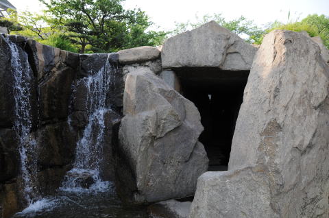 くぐり滝:幅50m,落差3mで、トンネルが設けられており、石橋で池を渡り、滝をくぐってトンネルの暗闇の神秘的な空間を抜ける。