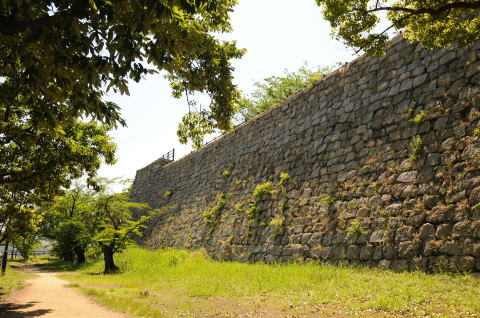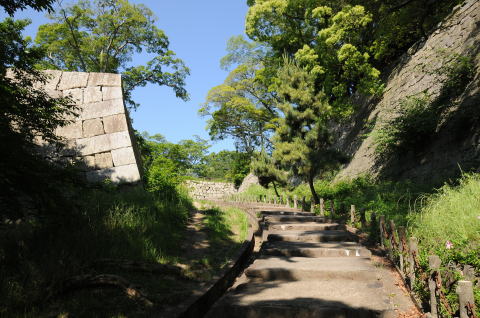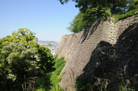 石垣の美:見返り坂、三の丸の石垣で、上端部が垂直で徐々に緩やかな曲線を描く。高さ約22mで、本丸まで三段の高さは約40mを誇る城壁です。