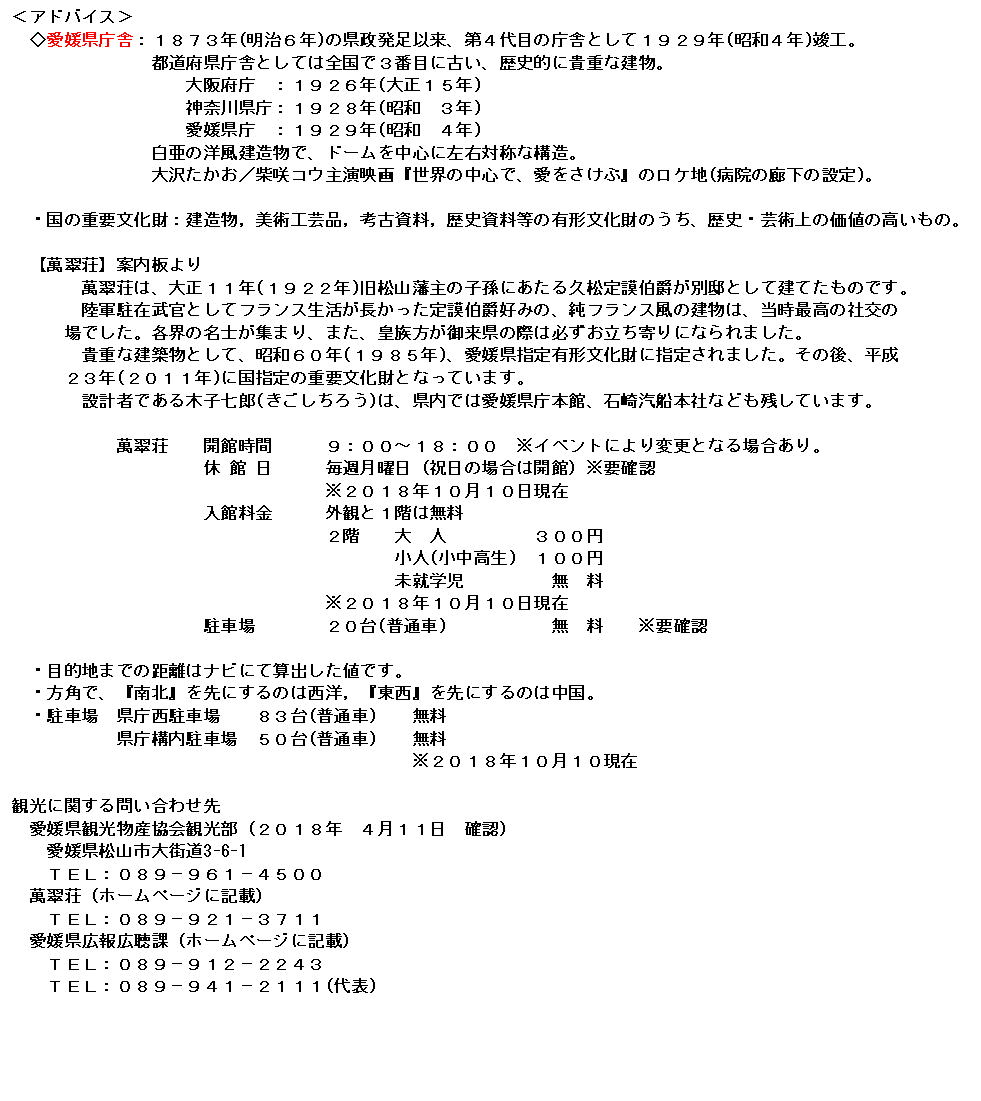 愛媛県庁舎:全国で3番目に古い白亜の洋風建造物で、ドームを中心に左右対称な構造。 映画『世界の中心で、愛をさけぶ』のロケ地ともなった。