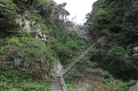白山洞門より望む神社鳥居への階段