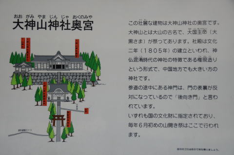 大神山とは大山の古名で大国主命(大黒様)を祀る。1805年(文化2年)の建立。権現造り形式で中国地方最大。