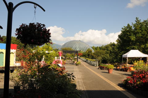 正面ゲートを抜けると花のモニュメントとフラワードームそして明峰大山が出迎えてくれる