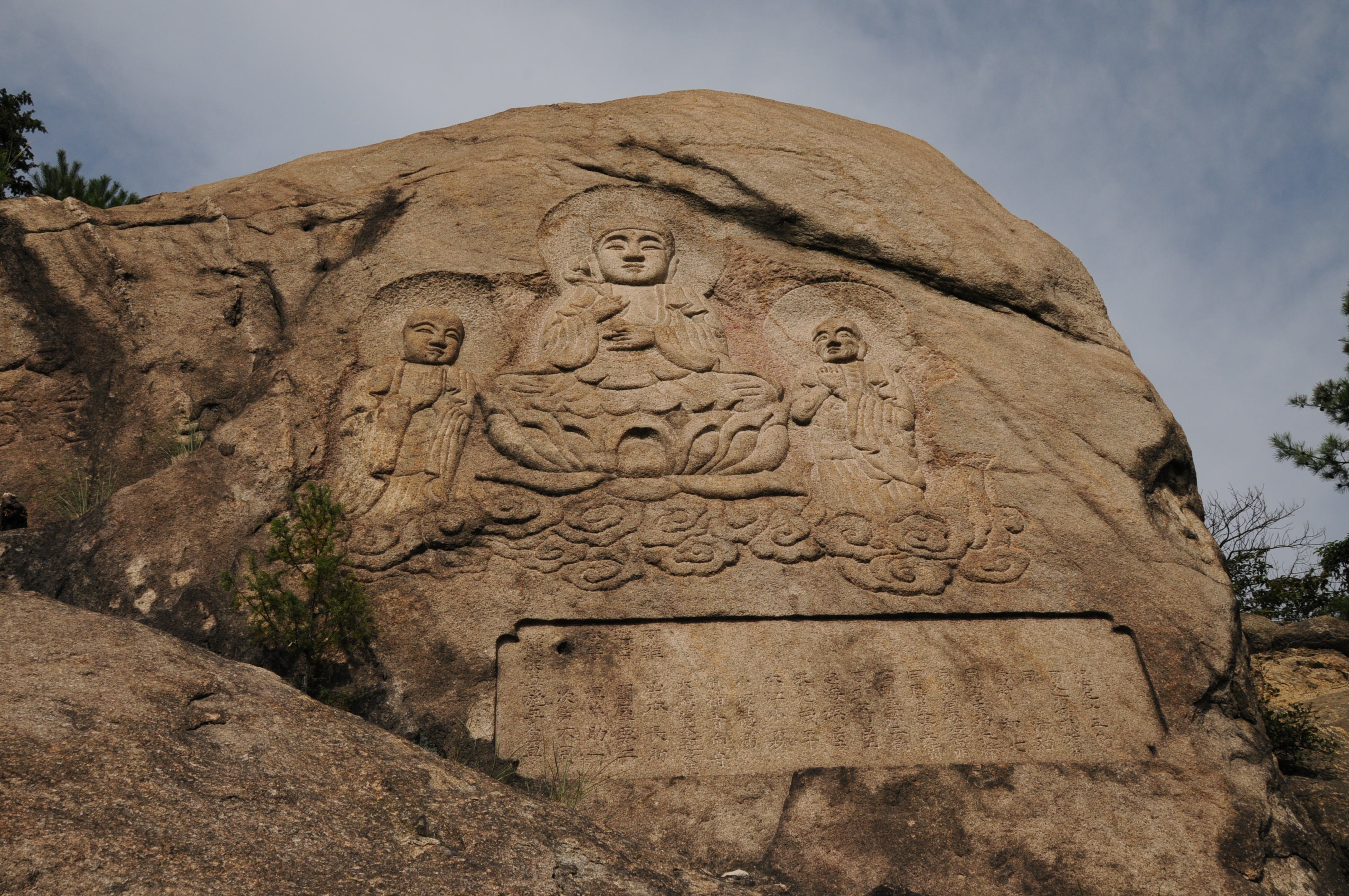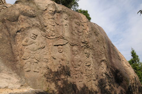 磨崖仏は、本堂の後の山頂にある巨大な花崗岩(土地の人は八畳岩と呼んでいる)の壁面に刻んである等身大の半肉彫の仏像群である。(案内板より)