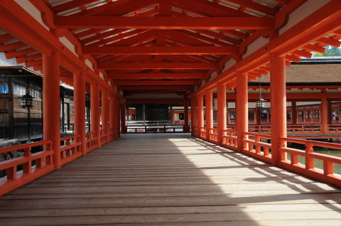 西回廊:東西合わせて約275m。床板の間に目透しという隙間があり、潮の圧力を弱め、海水や雨を海へ流す役割を果たすスリット構造で、釘は1本も使っていない。国宝です