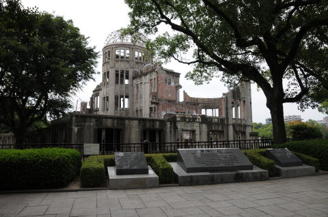 原爆ドーム北側付近から望む慰霊碑と原爆ドーム