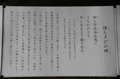 縁むすびの碑:すなわち、夫婦の契りの盃を交わされ うなじに手を掛け合い寄り添い合われて 今日に至るまで↓