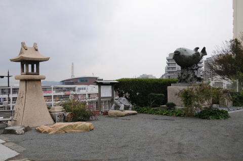 境内に佇む『ふぐの像』:日本一の大きさ。1990年(平成2年)再建。初代は1934年(昭和9年)建立
