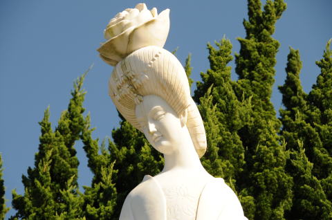 楊貴妃像:楊貴妃最期の地、馬嵬坡(ばかいは)に立つ像と同じもので、西安の地を向いて微笑んでいる。