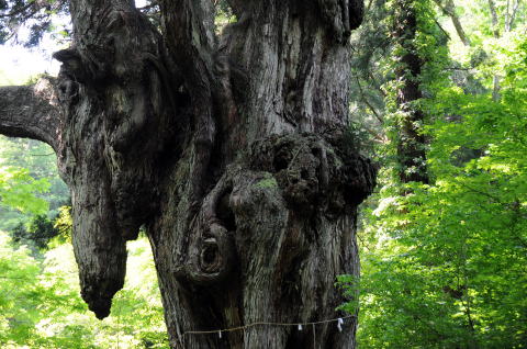 島根県指定の天然記念物『岩倉の乳房(ちち)杉』:樹齢約800年といわれ、幹回り11m,高さ38m,地上数mのところから上に向かって15本の幹に分かれている↓