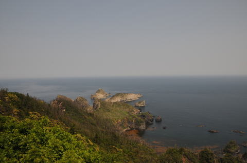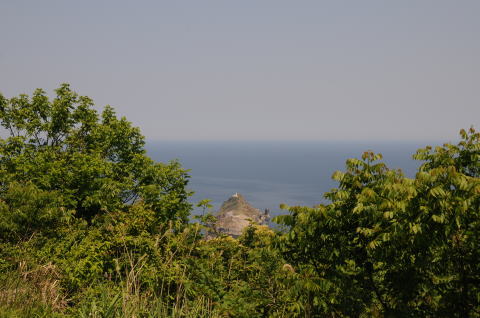 白島埼灯台から望む岬先端の風景(草木の間からわずかに見える先端の灯台)