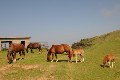 駐車場付近から望む丘の上の鬼舞展望所と馬