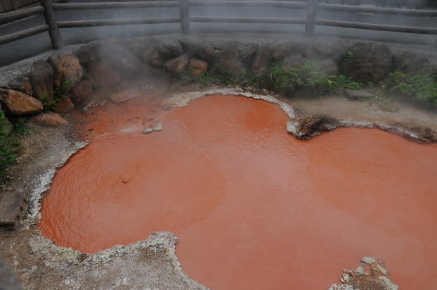 一丁目90度:池の色は地下による岩盤が地熱によりできたねばっこい色んな種類の粘土がとけだした色(酸化鉄の色ではありません)。