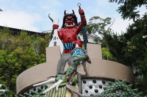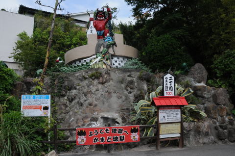二丁目100度:岩の間からは100度の蒸気が噴き出す。鬼の下にある釜と向かいにある釜は、一対の夫婦釜。