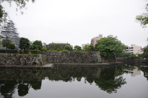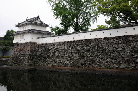 廊下橋:山里丸と西の丸を結ぶ堀の上に架けられていた渡り廊下。1996年(平成8年)に復元。長さ21.7m、幅員2.4m、橋脚高3.8m檜造り、漆喰塗り、檜皮葺。