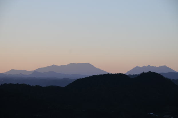奥に見える山並みが『阿蘇涅槃像』右から根子岳-高岳-中岳-烏帽子岳-杵島岳 阿蘇五岳